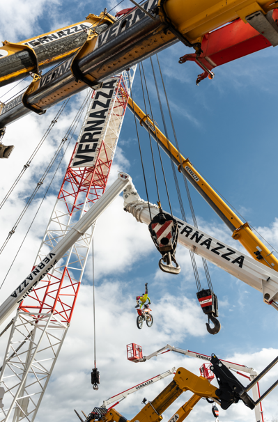 Per l’occasione è stata realizzata una scenografia straordinaria: autogru e piattaforme aeree Vernazza hanno formato un vero e proprio corridoio sospeso, con i bracci estesi a creare una struttura scenografica imponente. Sotto, una fila di carrelli elevatori con le forche alzate ha completato il percorso, trasformando il piazzale in un’arena tecnica dove potenza meccanica e precisione millimetrica hanno fatto da cornice alle evoluzioni del campione. All’interno di questo corridoio sospeso Vanni Oddera ha eseguito alcuni dei suoi salti più spettacolari, regalando un’esibizione ad alto tasso di adrenalina e tecnica.